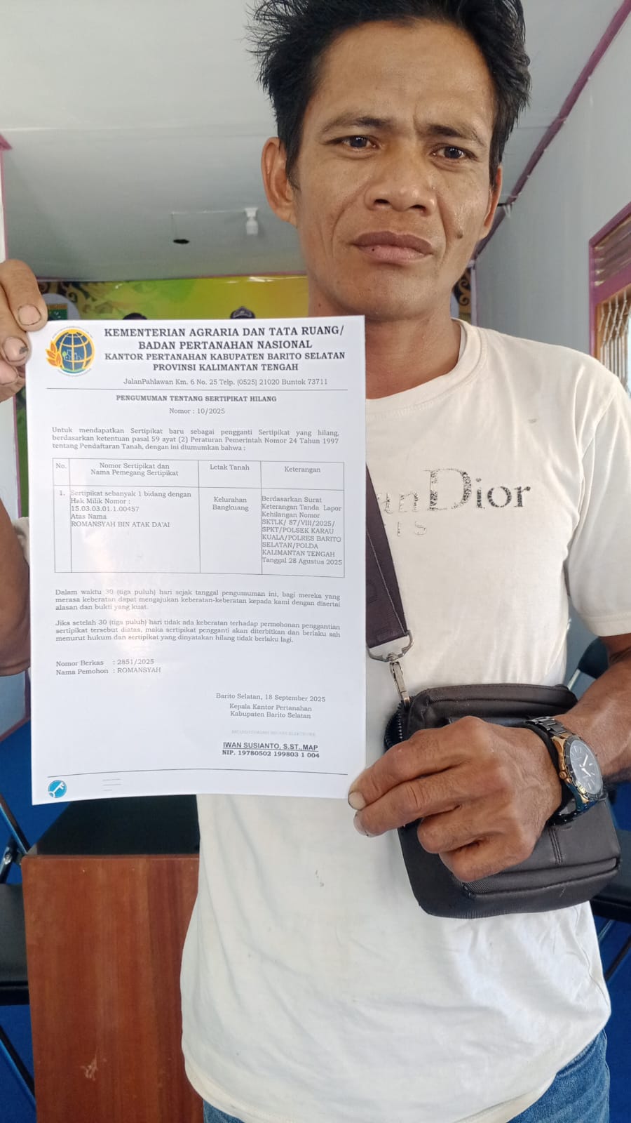 IKN Medianusantaranews. Com // Barito Selatan, 18 September 2025 — Kantor Pertanahan Kabupaten Barito Selatan, Provinsi Kalimantan Tengah, Mengumumkan Hilangnya Satu Bidang Sertifikat Tanah Atas Nama Romansyah Bin Atak Da’ai. Pengumuman Ini Tertuang Dalam Surat Resmi Bernomor 10/2025, Sesuai Dengan Ketentuan Pasal 59 ayat (2) Peraturan Pemerintah Nomor 24 Tahun 1997 Tentang Pendaftaran Tanah.