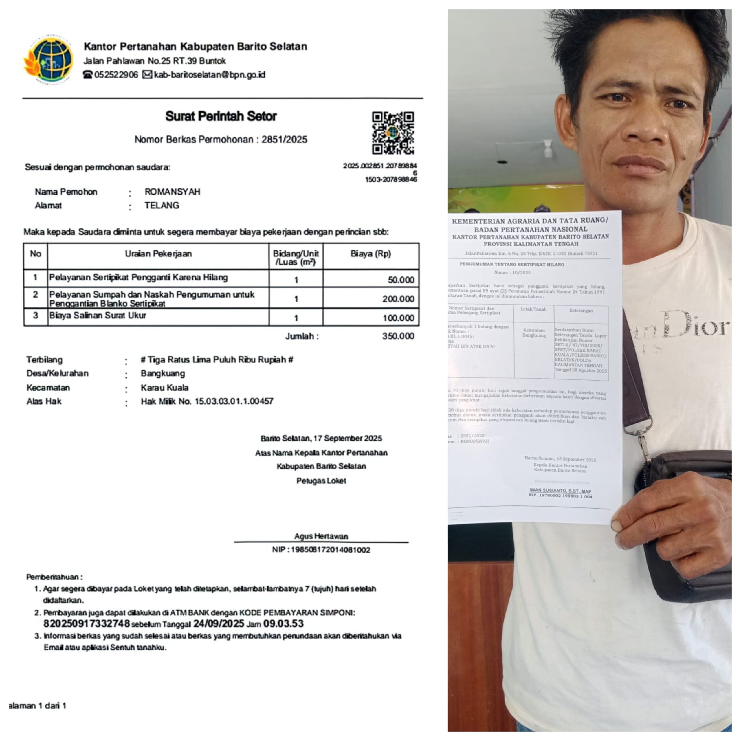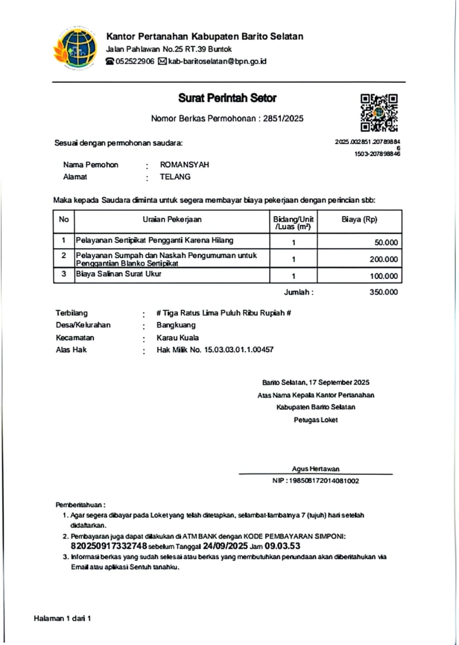 Dalam Pengumuman Tersebut Dijelaskan Bahwa Sertifikat Yang Hilang Memiliki Hak Milik Nomor 15.03.03.01.1.00457, Dengan Letak Tanah Di Kelurahan Bangkuang. Kehilangan Sertifikat Ini Telah Dilaporkan Kepada Pihak Kepolisian Nerdasarkan Surat Keterangan Tanda Lapor Kehilangan Nomor SKTLK/87/VIII/2025/SPKT/Polsek Karau Kuala/Polres Barito Selatan/Polda Kalimantan Tengah, Tertanggal 28 Agustus 2025.